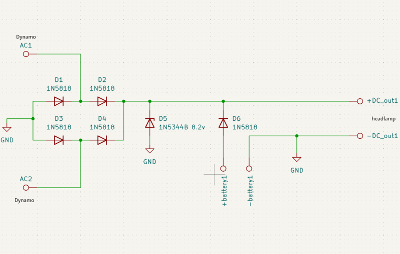 Circuit is as the original, except that there's a zener diode D5 added as a crude voltage regulator. I thought it best to give modern LED bulbs some protection.